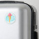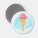 A yummy magnet with a delicious ice cream cone illustration, with a scoop of pink strawberry ice cream held by a waffle cone. Set on an aqua blue watercolor paint splatter / brushstroke.