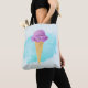 A yummy tote bag with a delicious ice cream cone illustration, with a scoop of purple ice cream inside a waffle cone. Set on an aqua blue watercolor paint splatter / brushstroke.