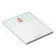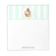 Personalized notepad illustrated with drawing of a 3 scoop ice cream sundae with colorful sprinkles. An ice cream cone with scoops of chocolate, strawberry and vanilla. A bowl of neopolitan ice cream with a cherry on top. Strawberries and a pineapple fruit sit beside the bowls. Summery and sweet. A mint green and white stripes pattern in the background.