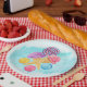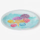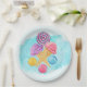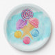 A cool paper plate design with 2 ice cream cones with pink and purple ice cream scoops. A lollipop with a spiral center. And some colorful candies. Set on a truquoise blue paint splatter.