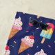 Pattern on blue background with creamy ice cream and popsicles, cherries and confetti floating around. Cute whimsical food design.