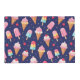 Pattern on blue background with creamy ice cream and popsicles, cherries and confetti floating around. Cute whimsical food design.