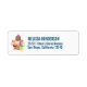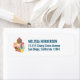Return address labels illustrated with drawing of a 3 scoop ice cream sundae with colorful sprinkles. An ice cream cone with scoops of chocolate, strawberry and vanilla. A bowl of neopolitan ice cream with a cherry on top. Strawberries and a pineapple fruit sit beside the bowls. Summery and sweet.