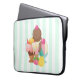 Laptop sleeve illustrated with drawing of a 3 scoop ice cream sundae with colorful sprinkles. An ice cream cone with scoops of chocolate, strawberry and vanilla. A bowl of neopolitan ice cream with a cherry on top. Strawberries and a pineapple fruit sit beside the bowls. Summery and sweet. A mint green and white stripes pattern in the background.
