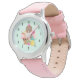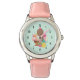 A child's watch illustrated with drawing of a 3 scoop ice cream sundae with colorful sprinkles. An ice cream cone with scoops of chocolate, strawberry and vanilla. A bowl of neopolitan ice cream with a cherry on top. Strawberries and a pineapple fruit sit beside the bowls. Summery and sweet.