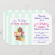 An inviation for an ice cream social. Illustrated with drawing of a 3 scoop ice cream sundae with colorful sprinkles. An ice cream cone with scoops of chocolate, strawberry and vanilla. A bowl of neopolitan ice cream with a cherry on top. Strawberries and a pineapple fruit sit beside the bowls. Summery and sweet.
