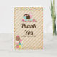 A thank you card with a sweet ice cream theme. Illustrated with a chocolate ice cream bar, 3-scoop sundae with a cherry on top, and a strawberry float. Little strawberries and cherries beside them. Colorful confetti surrounds the card with a diagonal striped background in a light brown color. Personalized message inside. Text on the front says: Thank You for being so sweet.