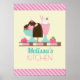 A chstom kitchen poster with your name. Top and bottom border have pink diagonal stripes. Illustrated with a chocolate ice cream bar, 3-scoop sundae with a cherry on top, and a strawberry float with whipped cream. Little strawberries and cherries along the bottom. Pale yellow background. Refreshing hot weather treats.
