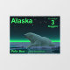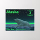 Another in the series of postage stamps for an independent Alaska. A peaceful moment in the long Arctic night. A Polar Bear rests at the edge of an open area in the pack ice. The Northern Lights glow in the distance; bright stars twinkle overhead. Text reading "Alaska," "Postage 3 Nuggets," "Polar Bear Ursus maritimus" also appears. Polar bears are endangered. How much longer will scenes like this be able to occur? Please help save Polar Bears from extinction.