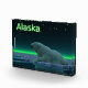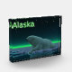 A peaceful moment in the long Arctic night. A Polar Bear rests at the edge of an open area in the pack ice.The Northern Lights glow in the distance; bright stars twinkle overhead. Text reading "Alaska" appears in glowing green and white. Polar bears are endangered. How much longer will scenes like this be able to occur? Please help save Polar Bears from extinction.