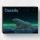 A peaceful moment in the long Arctic night. A Polar Bear rests at the edge of an open area in the pack ice.The Northern Lights glow in the distance; bright stars twinkle overhead. Text reading "Canada" appears in glowing blue and white.
