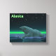 A peaceful moment in the long Arctic night. A Polar Bear rests at the edge of an open area in the pack ice.The Northern Lights glow in the distance; bright stars twinkle overhead. Text reading "Alaska" appears in glowing green and white. Polar bears are endangered. How much longer will scenes like this be able to occur? Please help save Polar Bears from extinction.
