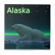 A peaceful moment in the long Arctic night. A Polar Bear rests at the edge of an open area in the pack ice.The Northern Lights glow in the distance; bright stars twinkle overhead. Text reading "Alaska" appears in glowing green and white. Polar bears are endangered. How much longer will scenes like this be able to occur? Please help save Polar Bears from extinction.