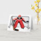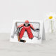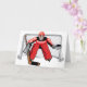 The goalie in ice hockey is a critical position and also one where you want to be wearing a lot of padding. This great design of an ice hockey goalie all padded up standing in his goal ready for the shot. The goalie is wearing red. This ice hockey goalie looks great on these greeting cards