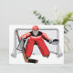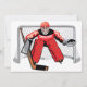 The goalie in ice hockey is a critical position and also one where you want to be wearing a lot of padding. This great design of an ice hockey goalie all padded up standing in his goal ready for the shot. The goalie is wearing red. This ice hockey goalie looks great on these invitations