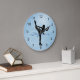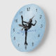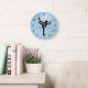 Ice Skater Design Wall Clock featuring the a pair of white ice skates against a blue ice graphic background, with customizable text.