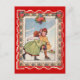 In this vintage image two young children are ice skating on a pond. The boy is holding both of the girl’s hands and is guiding her on the ice. The scene is framed in a typical old fashioned way with multiple layers of paper lace. a flower border, and two colors of paper that has been cut with a scalloped edge.