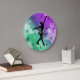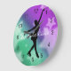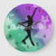 Ice Skating Figure Skating Design Wall Clock featuring the silhouette of a skater against a purple and teal green starry background, with customizable personalization