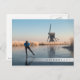 Postcard of an athlete ice skating on a frozen river past hoar-frosted reeds and a windmill on a beautiful winter morning in the Netherlands with a fading white bar and the text: 'Netherlands'.