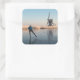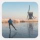 Photo sticker with an athlete ice skating on a frozen river past hoar-frosted reeds and a windmill on a beautiful winter morning in the Netherlands.