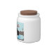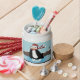 An adorable plaid scarf wearing penguin enjoys a winter day with some ice skating on a candy jar