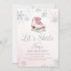 A beautiful ice-skating birthday invitation featuring soft pink tones, elegant silver glitter snowflakes, and watercolor ice skates. Perfect for winter birthdays and girls skating parties.