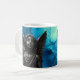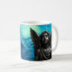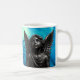 A sleek black-metal angel with reflective wings and vivid blue eyes stands before an aqua-teal, ice-textured backdrop, creating crisp contrast and a cool, ethereal mood. Perfect for fantasy art fans, gothic décor lovers, and modern spaces seeking a striking statement on mugs, wall art, and apparel.