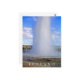 A beautiful view of a geyser shooting water in Iceland printed on a postcard.