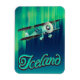 Iceland vintage style Travel poster of the Northern lights and a light aircraft flying past.