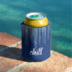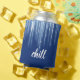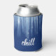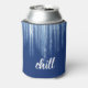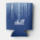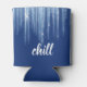 Fun can cooler, done in dark blue with graphics of icicles falling down from the top edge. White text reads chill and can be personalized to read what you want.