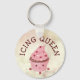 Icing queen in curved deep red uppercase font lettering. The letter Q is topped with a golden yellow crown. The lettering wraps around a chocolate cupcake with pink icing and a pink paper cup and cinnamon heart candy decorations. Set over a pink beige bokeh background.
