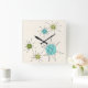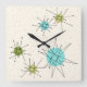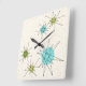 This Iconic Atomic Starbursts Square Acrylic Wall Clock (large print) pattern features iconic atomic starbursts. That’s right! The old school, cream colored background with gold speckles is the perfect backdrop for the vibrant turquoise, soothing celery, and kitschy pear green colored circles. The spots of color are sporadically placed in various sizes with overlaying black V shaped lines to form the mod sputnik starbursts. Styled after a 1950’s dish pattern, this retro inspired design has everything you need to be truly mid century modern.