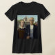 An iconic painting of a farmer holding a pitchfork and his wife in front of their house.