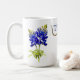 Unique mug design featuring the Bluebonnet flowers of Texas and a Texas Longhorn. The Bluebonnet flower is the state flower of Texas. In March and April, these beautiful flowers bloom in fields and freeway medians.
