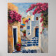 The painting features bright white buildings with blue accents, such as doors and windows, which are characteristic of the region. Vibrant pink bougainvillea flowers cascade over the walls and hang from balconies, adding a splash of color to the scene. A set of blue stone steps leads up to one of the buildings, and potted plants with pink flowers are placed along the pathway, enhancing the charming and serene atmosphere. The warm sunlight and clear blue sky create a bright and inviting ambiance, capturing the essence of a peaceful coastal town.