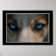 This wolf has intense icy blue eyes staring at you. The photo is zoomed in close on his face adding a sense of sharp powerful concentration. His beautiful eyes are surrounded by soft white and brown fur.