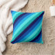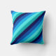 A 16” x 16” throw pillow featuring a cool pattern design of diagonal stripes in navy blue, cobalt blue, sky blue, icy mint teal, and light turquoise.