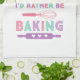 A cute kitchen towel for the baker in your life with "I'd rather be baking" in a fun retro font with illustrations of rolling pins and a whisk in pink, purple and teal.