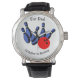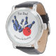 It's always time for bowling when you wear this personalized watch that features bowling pins and a bowling ball. The bold blue and white bowling pins have just be struck by a bright red bowling ball. I'd Rather be Bowling is written at the bottom of the watch, your name or title is written at the top. Perfect gift for a dad or grandfather who loves to bowl.
