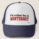 I'd Rather Be In Monterrey! Are you from Monterrey, Mexico? Do you have a friend or family member who loves Monterrey, Mexico? If so, this "I'd Rather Be In..." hat is what you're looking for! The design features "I'd rather be in" in small black lettering at the top and "Monterrey" in big red lettering at the bottom.