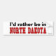 I'd Rather Be In North Dakota! Are you from North Dakota? Do you have a friend or family member who loves North Dakota? If so, this "I'd Rather Be In..." bumper sticker is what you're looking for! The design features "I'd rather be in" in small black lettering at the top and "North Dakota" in big red lettering at the bottom.