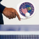 Badge of Idaho with flag of Idaho and flag of USA colors, rounded shape.