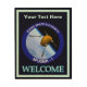 A humorous depiction of a potato as a satellite dubbed "Spudnik-1," with forks serving as antenna, in orbit around the earth. Features the Spudnik-1 mission patch superimposed on a starry background. Text reading, "WELCOME" also appears. There is also a place for you to add a bit of your own text.