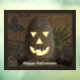 Potatoes substitute for pumpkins as Jack O'lanterns in Idaho. A potato, carved and lit in the manner of a Halloween pumpkin, sits atop a pile of spuds, set against a burlap sack. Customizable text reading, "Happy Halloween" also appears. You may change both the font and text color.