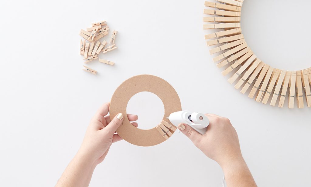 1. With a glue gun, apply a thin line of glue from the inner edge to the outer edge. Place a clothespin on top of glue, aligning the back of the clothespin to the inner edge. Press firmly for a few seconds to secure placement.