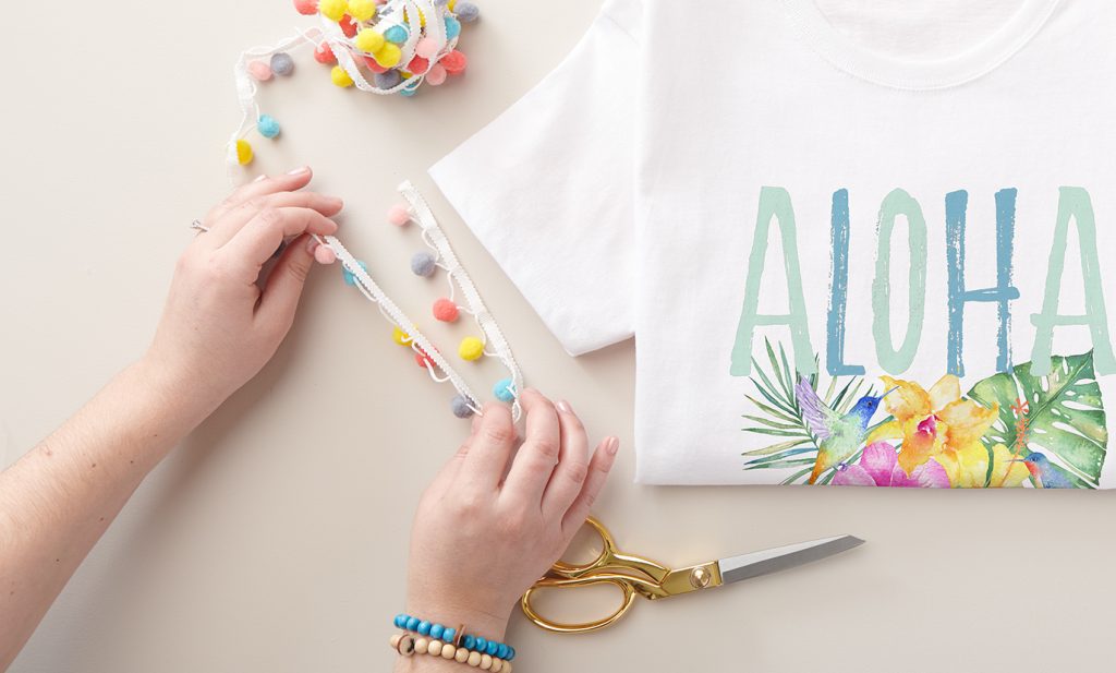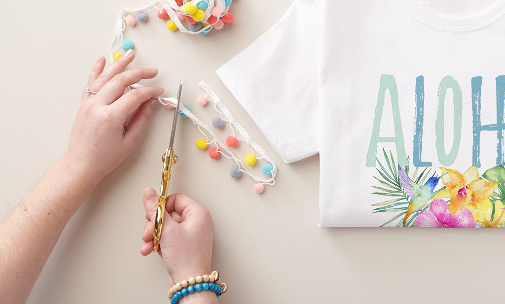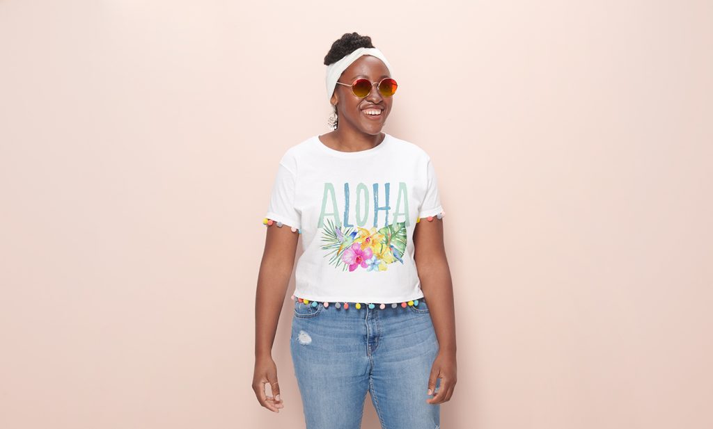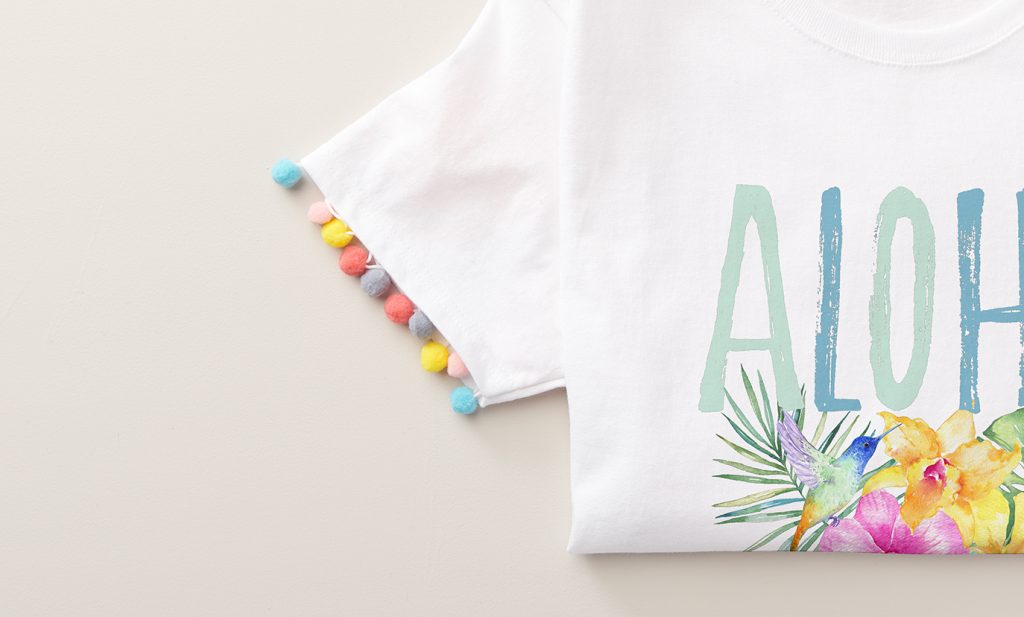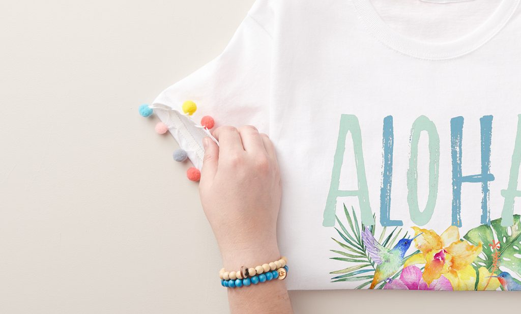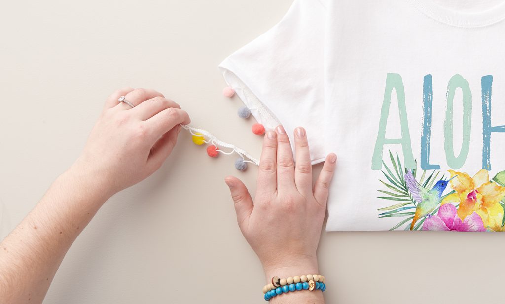 Here’s one that’s fun, fresh, and flirty! By adding colorful trim to the edges of a top, you can create this no-sew fringe shirt in minutes. This pom pom t-shirt is great to wear to the beach, summer parties, or music festivals.