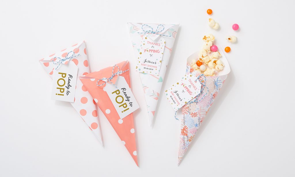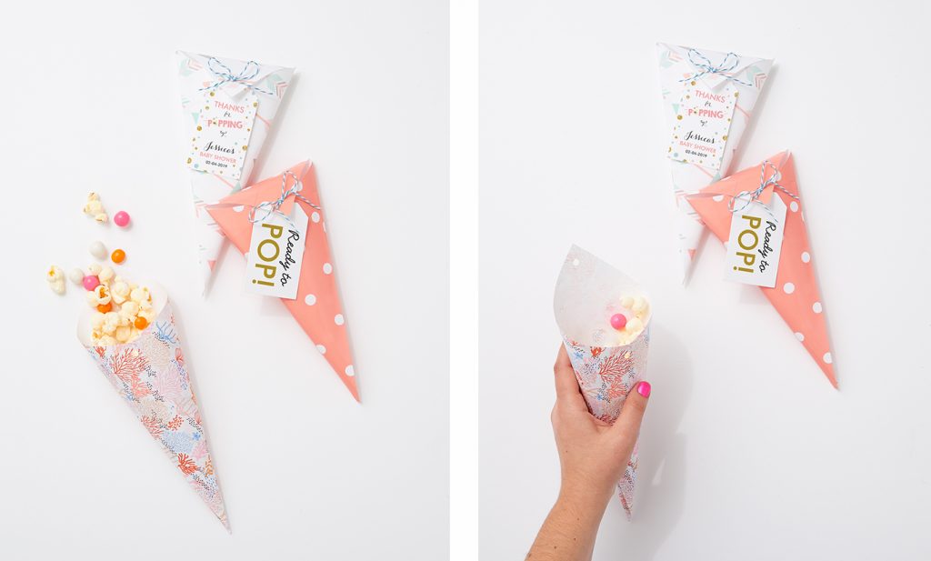 While planning my friend Jessica’s baby shower, I decided I wanted to pass out individual goodie bags filled with “Ready to Pop” treats. That inspired this DIY design – vibrantly printed wrapping paper pouches! These are super cute and make for a perfectly portioned snack or favor. I hope Jessica is impressed by the popcorn pun and personalization.