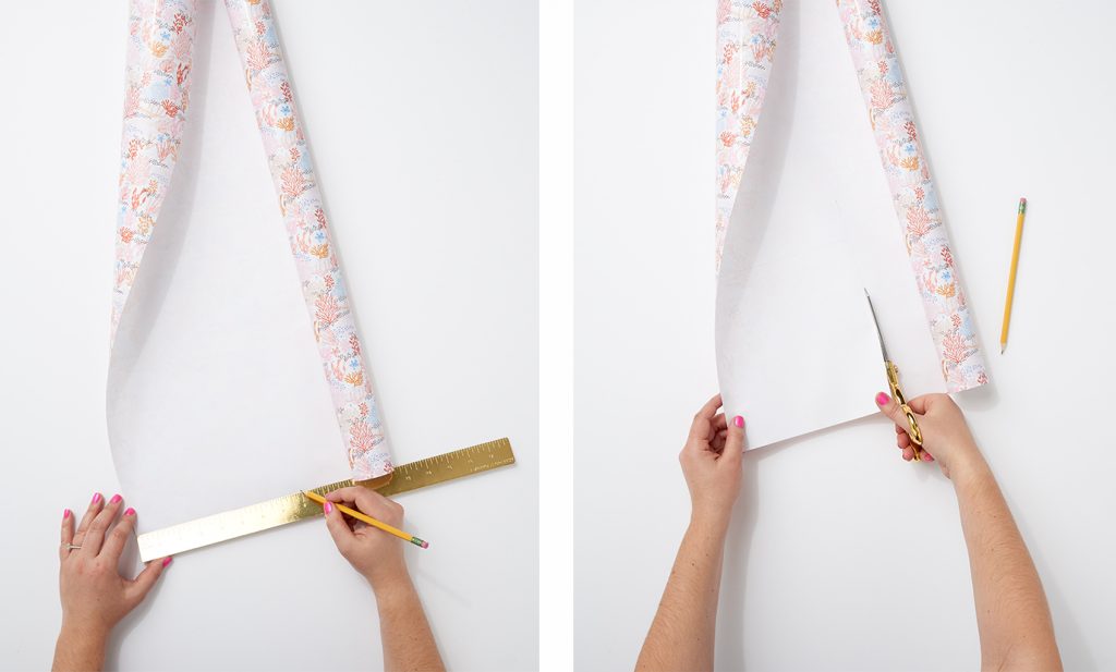 1. Using your ruler and pencil, measure and mark 8” x 8” squares on the wrapping paper of your choice. Cut along the penciled lines. Continue this as many times as you need to account for the number of pouches you’d like to make.