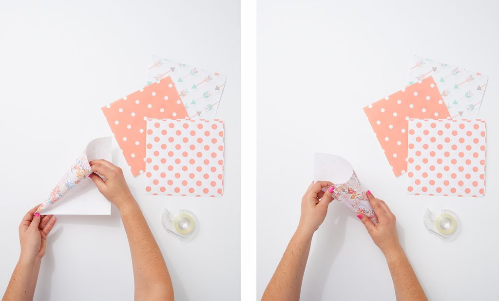 2. To achieve the body of the pouch, grab a square and face the wrapping paper design-side down. Roll a corner inward creating a cone shape. Adhere double-sided tape to the rolled corner so the designed edge is attached to the white side of the paper. Then wrap the opposite corner on top of the first roll, overlapping and completing the cone. Add another piece of double-sided tape to the inside of the paper.