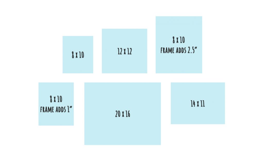 1. First, map out your gridded arrangement. I did this by measuring all of my posters and canvases, then mocking them up digitally in a configuration that I liked. If doing it digitally isn’t for you, feel free to place the pieces on the floor to see what arrangement you like best or draw the design on a piece of paper.